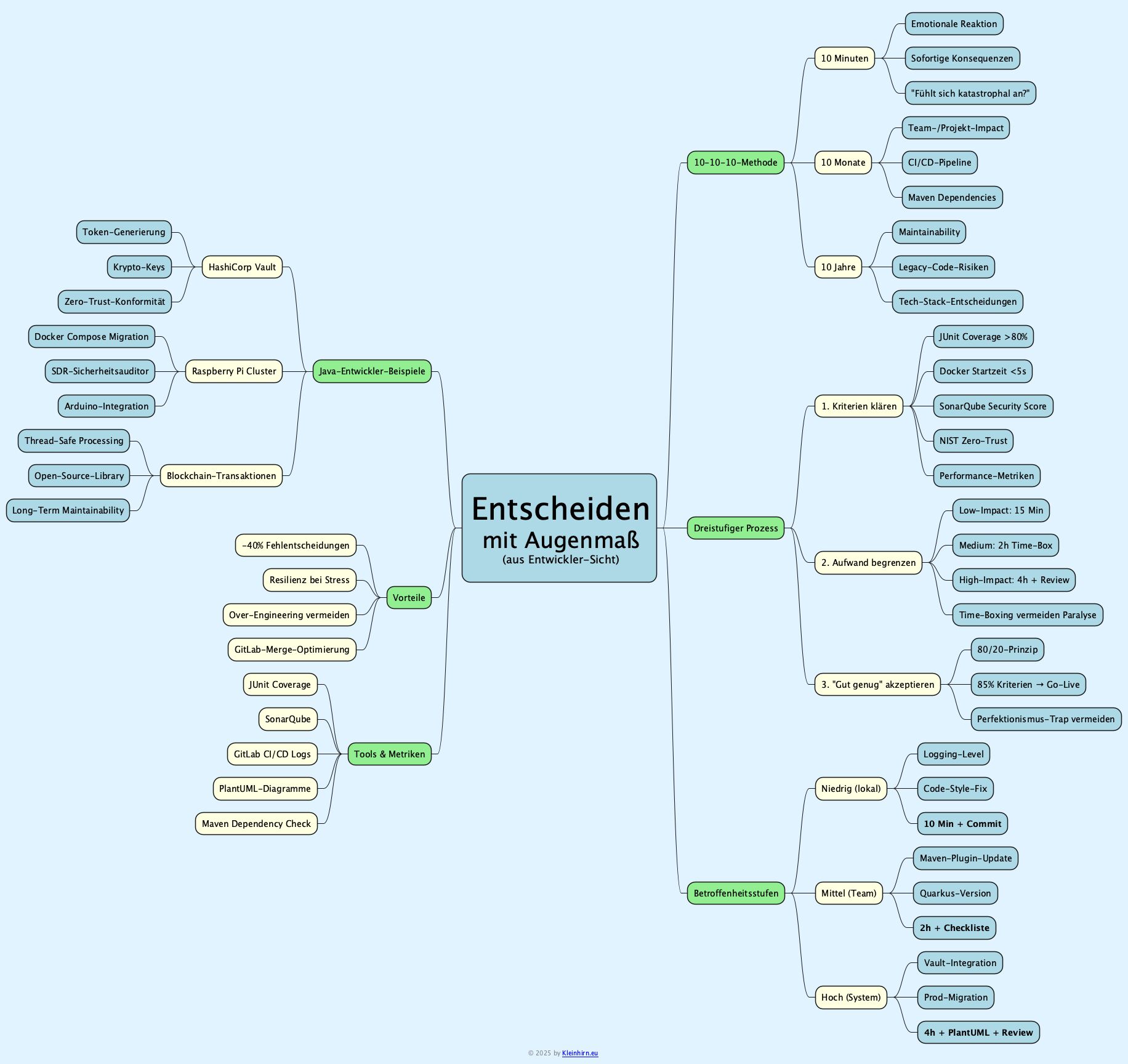 In der Softwareentwicklung reicht nicht jede Entscheidung eine epische Code-Review oder ein volles War Room-Meeting. Eine triviale Dependency-Update in einem Microservice mit Quarkus? Eine kurze JUnit-Suite reicht. Doch bei der Auswahl eines HashiCorp Vault-Setups für sensible Krypto-Keys oder der Migration eines Raspberry Pi-Clusters auf Docker Compose? Hier muss die Tiefe der Analyse dem Impact entsprechen: Anzahl betroffener Stakeholder, finanzielle Konsequenzen, Sicherheitsrisiken und Langzeitwirkungen.